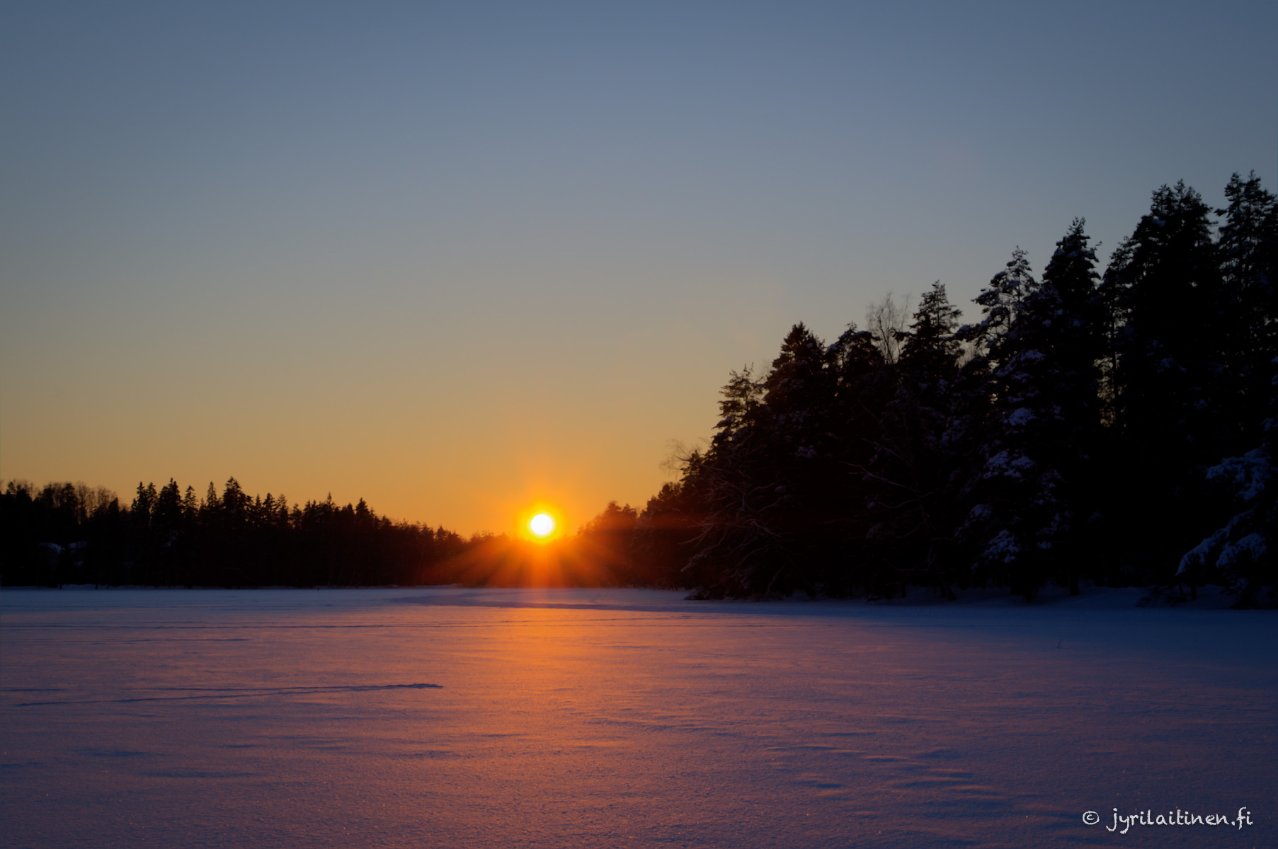 Kirkas ja kuulas pakkassää, 16 astetta pakkasta. Menin läheiselle järven jäälle kävelylle katsomaan auringonlaskua.